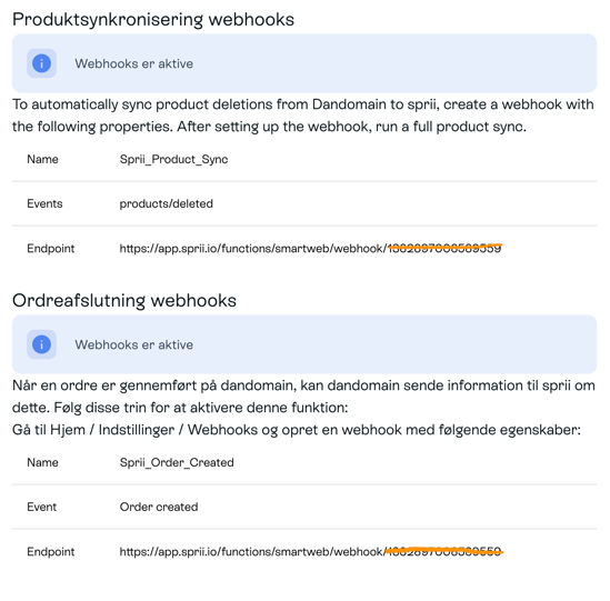 Go to your Dandomain backend and go to Settings. Then click on Webhooks, and create a webhook with the properties listed in the webshop integration settings on the Sprii platform: