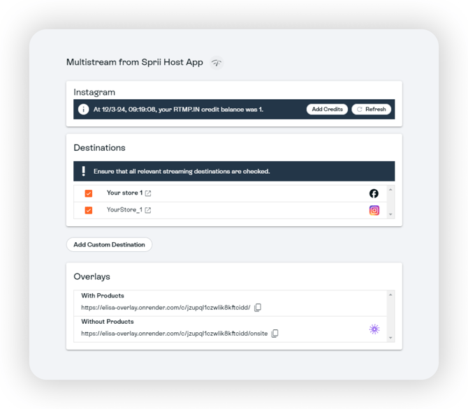 Om Instagram-destinationen inte visas, se till att RTMP.IN är aktiverat i Sprii-plugins och att ditt Instagram-konto är kopplat till din Facebook-sida.